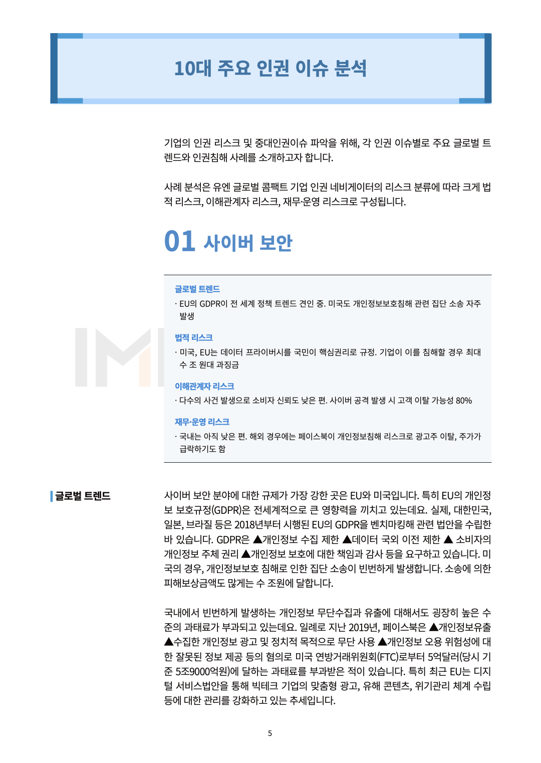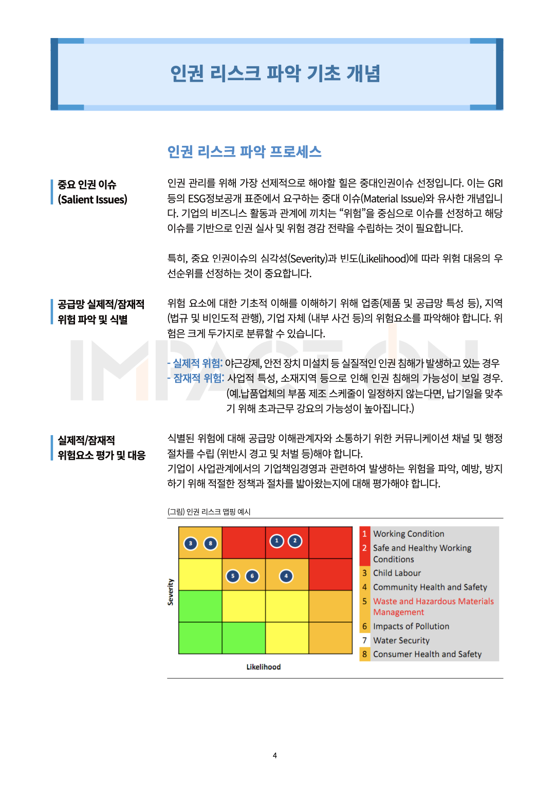 이에 임팩트온은 주요 글로벌 기업의 인권 보고서와 유엔 글로벌 콤팩트의 기업 인권 네비게이터를 분석해 10개의 주요 인권 이슈를 선정했습니다. 각 이슈 별로 기업이 주의해야 할 사항은 무엇인지, 과거 발생했던 주요 사건사고와 이로 인해 수반되는 리스크는 무엇인지 상세히 분석하여 기업들의 인권 리스크 파악에 도움을 드리고자 합니다.