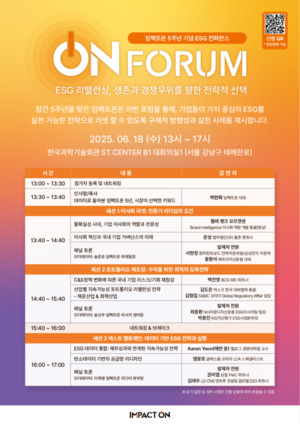 ESG는 이제 ‘선언’의 시대를 넘어, 전략과 실행의 전환기로 접어들었습니다. 창간 5주년을 맞은 임팩트온은 오는 6월 18일 『On Forum: ESG 리밸런싱, 생존과 경쟁우위를 향한 전략적 선택』을 통해, 기업들이 가치 중심의 ESG를 실천 가능한 전략으로 리셋할 수 있도록 구체적 방향성과 실천 사례를 제시합니다. 이번 제1회 온포럼은 지속가능성과 수익을 동시에 추구해야 하는 기업을 위해 세 가지 핵심 전략 축—이사회, 사업 포트폴리오, 데이터—를 중심으로 구성됐습니다. 이 주제를 심도 있게 논의하기 위해 국내외 학계, 기업,
