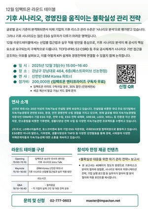 임팩트온이 오는 12월 3일 개최되는 라운드테이블에서 『기후 시나리오 – 불확실성 대응을 위한 위기관리 전략』 보고서를 공개한다.보고서는 강화되는 국제 공시기준(IFRS S2, ESRS E1)과 글로벌 시나리오 프레임워크(NGFS·IEA·IPCC)를 기반으로, 기업이 기후리스크를 체계적으로 관리하기 위해 이해해야 할 핵심 내용을 정리했다. 기후 시나리오 분석의 개념과 목적, 물리·전환 리스크 구조, 공개 시나리오 활용 방식 등을 실무 관점에서 설명한다.특히 실무진이 실제 업무에 적용할 수 있는 기후리스크 분석 5단계 절차를 중심으로