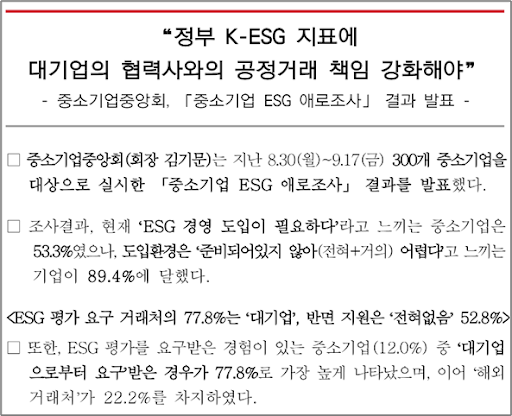 초기, 대기업 중심으로 움직이던 ESG 경영의 트렌드는 법적, 제도적 요인 및 사회 전반의 ESG 인식 변화에 따라 대기업 공급망에 포함된 중소기업으로 확장되고 있다. 중소기업의 ESG 경영의 필요성 및 중요성에 대한 인식은, 주요 수익원이라고 할 수 있는 대기업과 환경과 사회 전반에 대한 관심이 높아진 대중의 요구 등과 맞물려 이전 대비 충분히 높아진 것처럼 보인다.
