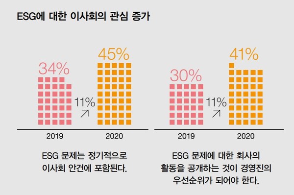 신종 코로나바이러스 감염증(코로나19) 대유행에 따른 경기 침체 불확실성이 커지며 기관투자자들은 장기적이고 지속가능한 비즈니스 모델을 만드는 것에 대한 중요성을 강조하고 있다. 이런 배경에 기업의 이사들 역시 경영진이 우선시해야 할 어젠다로 ESG를 꼽는 비율이 높아진 것으로 나타났다.