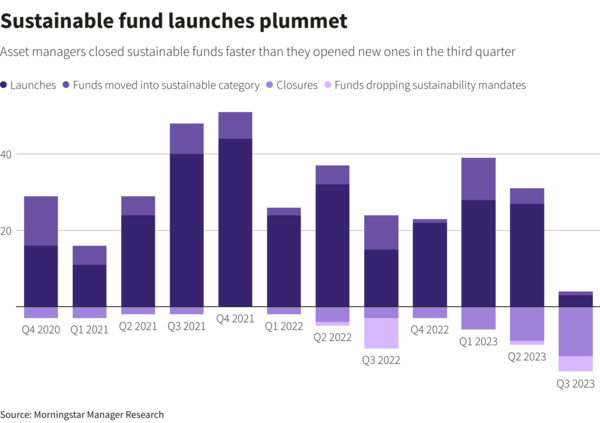 미국 펀드 시장에서 사상 처음으로 ESG펀드의 해산 건수가 신규 런칭 숫자를 앞선 것으로 나타났다. 투자 리서치 전문기관 모닝스타(Morningstar)에 따르면 23년도 3분기 신규 런칭한 ESG펀드는 3개에 불과하지만, 해산한 ESG펀드는 무려 13개에 달했다. 2분기 ESG펀드의 신규 런칭이 27건, 해산이 9건이었던 것을 감안하면 하락세가 두드러진다.