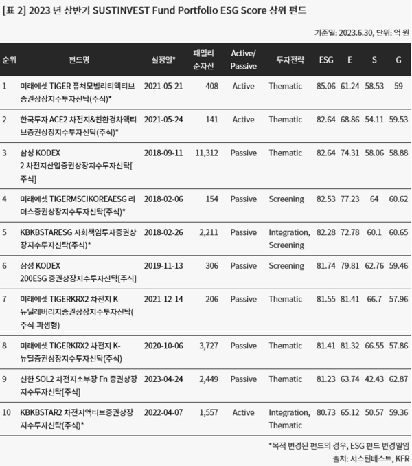 보고서는 ESG점수 상위 10위까지의 펀드 목록을 공개했다. ESG 성과 1위는 ‘미래에셋 TIGER 퓨처모빌리티액티브증권상장지수투자신탁(주식)’이 등극했다. 서스틴베스트는 이 펀드가 다른 펀드들보다 자산규모가 작은 기업에 투자하는 비중이 높음에도 전반적으로 ESG 성과가 뛰어난 종목에 투자하여 높은 점수를 획득했다고 설명했다.