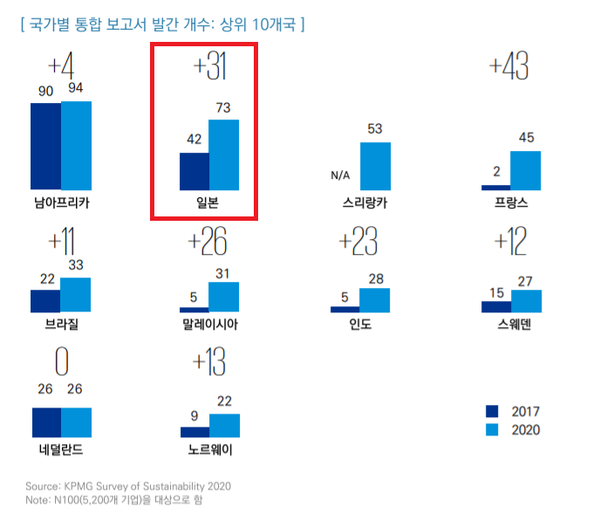 삼정KPMG의 보고서에 따르면, 전세계 평균을 끌어올린 주역 중 하나는 일본이다. 2017년 지속가능경영보고서 발간율 42%에 머물렀던 일본은 작년 조사에서 73%로 급격히 상승했다. 특히 이번 조사에서 보고서 발간 개수로 상위 10개국에 오르기도 했다.