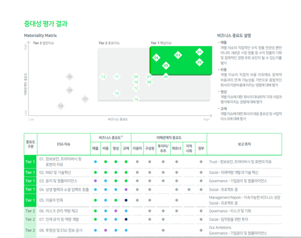 네이버의 ESG 보고서의 중대성 평가에서, 정보보안, 프라이버시 및 표현의 자유 R&D 기술혁신 윤리 및 컴플라이언스 상생 협력과 소셜임팩트 창출 이용자 만족 등을 가장 중요한 이슈라고 밝히고 있다.