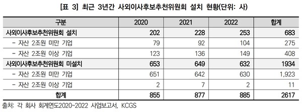 또한, 자산 2조 원 이상 기업 중 사외이사후보추천위원회를 설치하지 않은 기업은 자산총계가 당해 연도에 2조 원을 초과한 기업으로 그 다음 해에 모두 사외이사후보추천위원회를 설치한 것이 확인됐다.