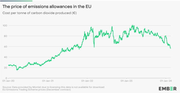 S&P글로벌은 13일(현지 시각) 같은 날 EU의 탄소가격이 2021년 10월 이후로 28개월 만에 최저치를 기록했으며, 2023년 4분기 이후로 급격히 하락해왔다고 분석했다. S&P 글로벌은 2024년 평균 가격이 톤당 63.9유로(약 9만원)로 급락할 것으로 예상했다. 이는 2023년 85.3유로(약 12만원), 2022년 81.5유로(약 11만원)와 비교하면 크게 떨어진 수준이다. S&P글로벌은 2월 톤당 50유로(약 7만원)까지 떨어질 수 있다고 예측했다.
