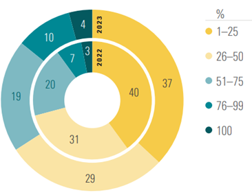 첫 번째는 글로벌 펀드평가사인 모닝스타가 수행한 조사 결과다. 전체 투자자산 중 몇 %에 ESG를 반영하는가, 라는 질문에 50% 이상의 투자자산에 ESG를 고려한다고 응답한 비중이 2022년 30%에서 2023년에는 33%로 늘었다.