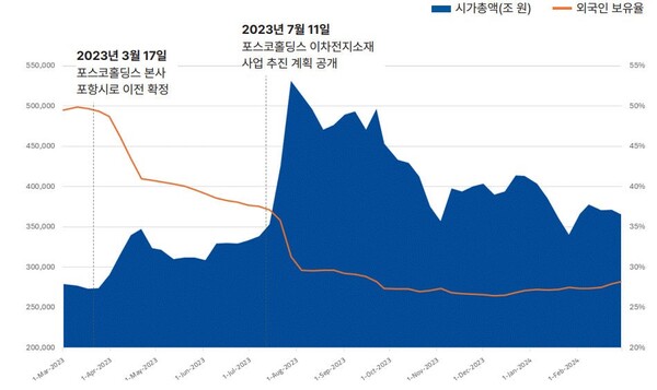 일각에서는 2022~2023년 사이 여러 해외 기관 투자자는 이차전지 소재 분야에서 이익을 실현하면서 포스코홀딩스 주식을 매각했다는 분석이 나온다. 포스코홀딩스의 주식은 출범 당시 주당 30만원대에서 최고 76만원까지 급등했으며, 현재는 44만원이다.