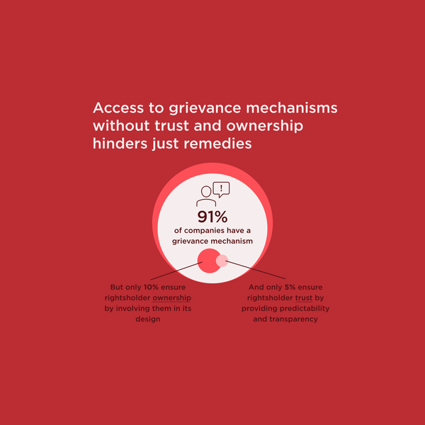 실제, 글로벌 인권경영 전문기관 세계벤치마킹연합(World Benchmarking Alliance)의 조사결과 91%이 기업들이 고충처리제도를 수립했다고 밝혔는데요. 하지만 제도의 설계에서 이해관계자의 참여가 이루어졌다고 답한 응답자는 10%에 불과했고, 고충처리제도의 예측성과 투명성이 보장되었다고 답한 응답자는 5%에 불과했습니다.