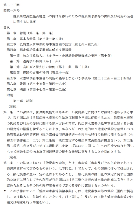 이 법안은 ▲독립 행정법인 에너지 금속 광물자원 기구의 업무 ▲항만법의 특례 ▲고압가스 보안법의 특례 ▲도로 점용의 특례 ▲수소 등 공급사업자의 판단의 기준이 될 사항 등을 비교적 간결하게 요약하고 있다.
