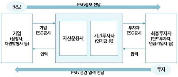 그러나 ESG 펀드 공시가 가진 더 궁극적인 목적이 있다. 투자의 힘을 사용해 지속가능한 사회로의 전환을 촉진하는 것이다. 이 말이 언뜻 이해되지 않을 수 있다. 요즘 많이 들리는 ‘밸류체인’이라는 개념을 떠올려 보자. 원재료부터 생산기업, 그리고 최종 소비자까지 이어지는 이 밸류체인이라는 개념을 투자 시장에 대입해 보면 투자 대상인 기업에서 시작해 투자기관을 거쳐 최종투자자로 이어지는 ‘투자 밸류체인’이 된다.