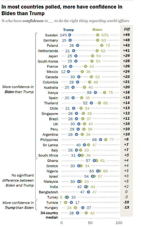 한편 미 여론조사 기관 퓨리서치센터가 11일(현지시각) 발표한 설문조사 결과에 따르면, 세계 각국 국민 중 43% 가량은 바이든 대통령의 연임을 바라고 있다. 트럼프 당선을 바라는 국민은 28%에 그쳤다.