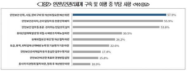 기업들은 이러한 조치사항 중 가장 부담이 되는 사항으로‘안전보건에 필요한 예산 마련’(57.9%)을 꼽았다. 다음으로는‘안전보건관리자, 담당자 등 전문인력 배치’(55.9%), ‘안전보건업무 전담조직 설치’(53.8%) 등 순이었다.