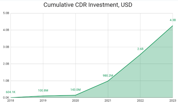 세계 최대의 탄소 상쇄 데이터업체인 얼라이드오프셋(AlliedOffsets)이 지난 1월 CDR 시장을 분석한 보고서에 따르면, 2023년까지 총 90건의 투자가 있었으며 정부 지원금을 제외하고 누적 43억 달러(약 6조원)가 투입된 것으로 나타났다. 투입되는 자금 규모는 계속해서 커지고 있다. 지난해에는 무려 17억 달러(약 2조원)가 투자됐다.