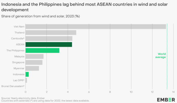 인도네시아와 필리핀은 아세안 지역의 다른 대부분의 국가보다 전력 구성에서 풍력 및 태양광이 차지하는 비중이 작다.