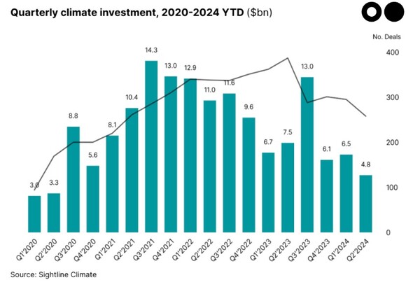 기후테크 벤처캐피털(VC)의 투자 흐름을 추적하는 미국의 사이트라인 클라이밋(Sightline Climate)은 지난 5일(현지 시각) 2024년 상반기 기후테크 투자가 총 113억달러(약 16조원)로 2023년 상반기와 비교해서 20%, 하반기 대비 41%가 줄었다고 분석한 보고서를 발표했다.