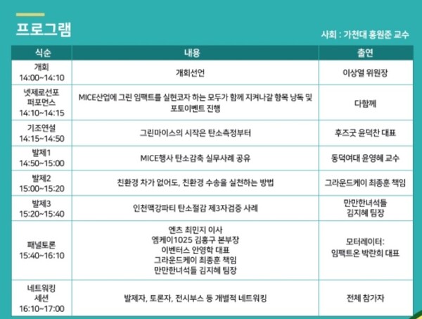 주요 세션은 탄소배출 측정과 감축 전략을 주제로 윤덕찬 후즈굿 대표가 기조연설을 맡고, 윤영혜 동덕여대 글로벌MICE학과 교수, 최종훈 그라운드케이 책임, 김지혜 만만한녀석들 팀장이 발제를 진행한다. 윤영혜 교수는 MICE행사의 탄소감축 실무, 최종훈 책임은 친환경 수송, 김지혜 팀장은 탄소절감 제3자 검증에 대한 실제 사례를 공유할 예정이다.