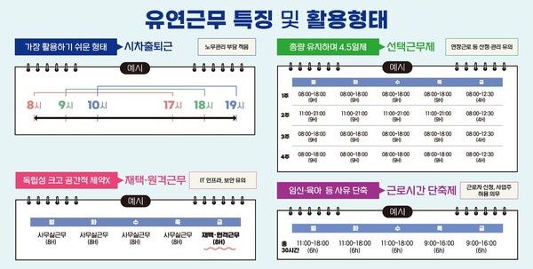 매뉴얼에는 시차출퇴근, 선택근무제, 재택‧원격근무, 근로시간 단축제의 4가지 제도를 소개하며, 유연근무 도입 기초단계의 설문조사 예시부터, 선택 가능한 실제 모델, 취업규칙 개정 등 요건, 초과근무 등 관리의 유의점과 같이 실무상 유용하게 활용될 수 있는 방법들을 세세하게 소개하고 있다.