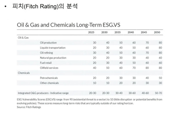 다보스포럼(WEF)에서 올해 진행한 글로벌 리스크인식 조사결과, 10대 리스크 이슈 중 환경이 7개를 차지하는 것으로 드러났다. 또한 글로벌 신용평가사 피치가 산업별 위험도를 측정한 결과, 대표적인 좌초자산이라 불리는 석유·가스업종은 2050년경 위험도 80점을 기록하는 등 환경 이슈가 산업의 존폐를 결정할 정도로 중요해졌다고 설명했다. 이 교수는 “S(사회)나 G(지배구조)도 중요하지만, 환경이 주는 임팩트는 두 영역을 뛰어넘고 있다”고 풀이했다.