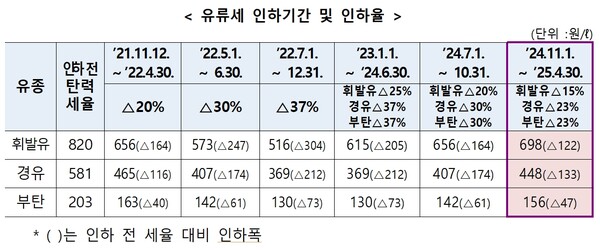개정안은 국내외 유가동향 및 국민들의 유류비 부담 등을 고려한 것이다. 이번 개정을 통해 인하 전 세율 대비 휘발유 ▲122원/리터(ℓ), 경유 ▲133원/리터(ℓ), 액화석유가스(LPG)부탄 ▲47원/리터(ℓ)의 가격 인하 효과가 향후 2개월간 유지되어 국민들의 유류비 부담 경감에 기여할 것으로 기대된다.