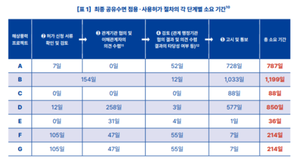 보고서는 주요 지연 원인으로 기초지자체가 법령에 규정되지 않은 민원인의 동의서까지 요구하는 관행을 꼽았다. 현행 '공유수면법'은 어업인 등 수면 사용권자의 동의만 필요하다고 규정한다. 하지만 실제로는 인근 주민들의 동의서까지 요구받고 있다는 것이다.