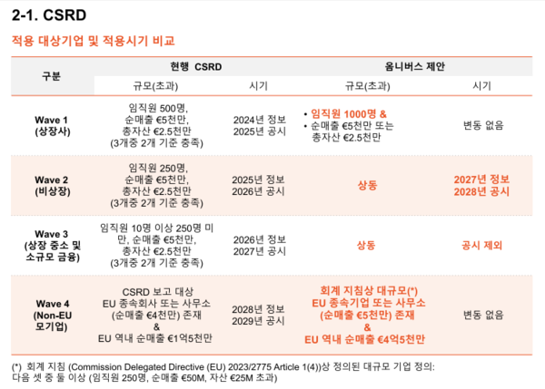 EU 지속가능성공시지침(CSRD) 개정안의 핵심은 공시대상 규모를 대폭 줄이는 것이다. '웨이브1(Wave1, 상장사)'의 경우, 기존 임직원 500명, 순매출 5000만유로, 총자산 2500만유로 3개 중 2개 항목 충족에서, 임직원 기준이 기존 500명에서 1000명으로 변경됐다.