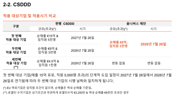 기존 적용 대상 규모가 2027년부터 매년 순차적으로 적용될 예정이었지만, 옴니버스 패키지에는 순매출 9억유로, 임직원 3000명 이상 기업에 한해 2028년 7월 26일부터 시행되는 것으로 변경됐다.