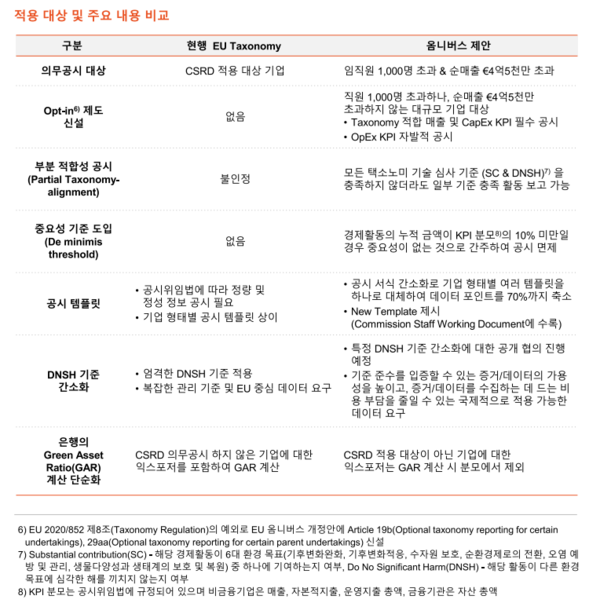 이번에 발표된 옴니버스 패키지에서 EU 택소노미의 경우 공시 의무 대상이 축소되고, 새로운 공시 방식(Opt-in 제도) 도입, DNSH(Do No Significant Harm) 기준 간소화 등의 변화가 예고됐다.