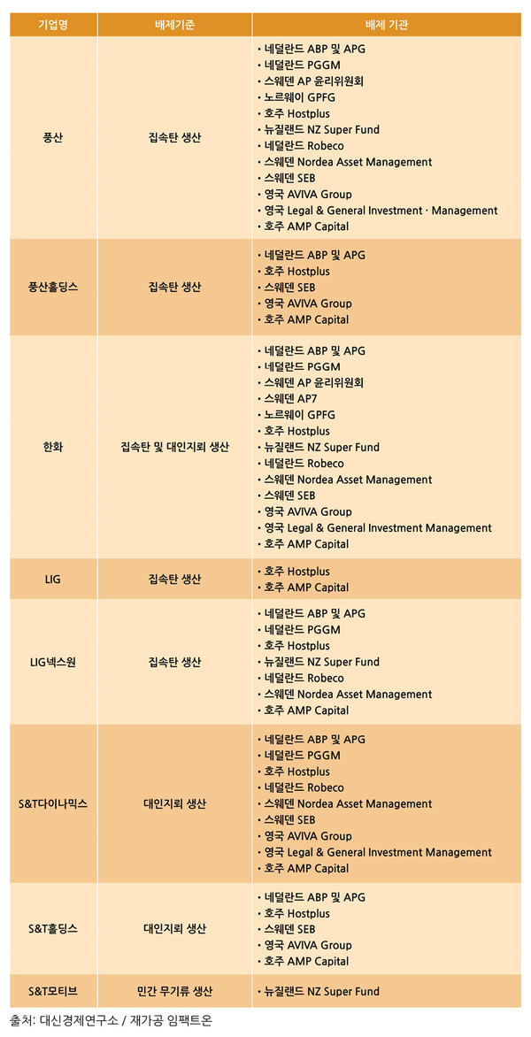 작년 11월 분산탄 사업을 완전히 분리 매각한 한화가 대표적인 투자 배제 기업에 올랐다. 한화는 집속탄 및 대인지뢰 생산을 이유로 네덜란드 공적연기금인 ABP와 APG, 노르웨이 GPFG 등 세계 10대 연기금 2곳을 포함해 총 13곳의 연기금과 자산운용사로부터 투자 대상에서 제외 당했다. 무기 생산 관련 산업에 투자를 금지하는 국제 조약에 근거한 제품 기반 배제 유형에 해당했기 때문이다.