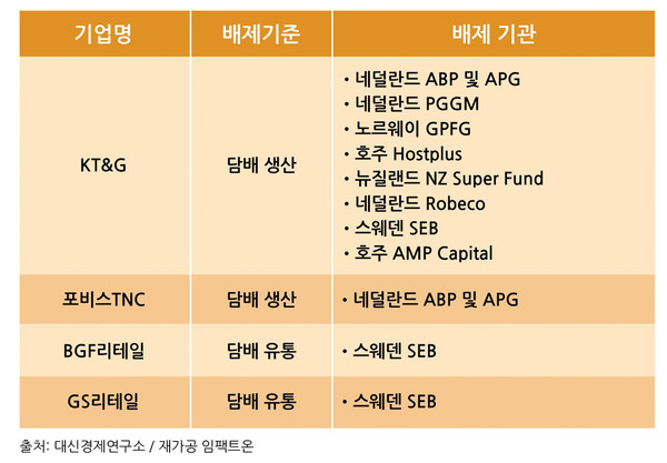 대표적인 죄악주에 해당하는 담배와 관련된 KT&G·포비스TNC·BGF리테일·GS리테일 국내 기업 4곳도 세계 4위 공적연기금 네덜란드 APG로부터 투자를 받을 수 없게 됐다. 특히 담배 수출로 매년 1조원의 돈을 벌어들이고 있는 KT&G의 경우 노르웨이 GPFG, 스웨덴 SEB, 호주 AMP 캐피털 등 8곳으로부터 배제된 것으로 밝혀졌다.