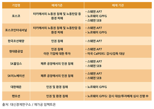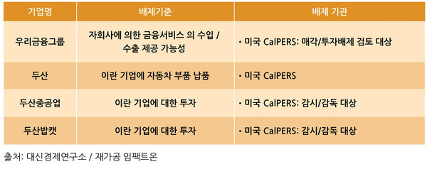 대신경제연구소 ‘해외 주요 연기금 및 자산운용사의 책임투자와 투자제한 동향으로부터의 시사점’ 보고서에 따르면, 한화·SK홀딩스·우리금융그룹·두산·포스코 등 굵직한 국내 기업들이 세계 10대 연기금 투자 배제 기업에 오르는 불명예를 안은 것으로 드러났다. 크게 ▲무기생산 ▲담배, 석탄 생산 ▲인권 ▲이란 제재를 위반한 것으로 나타났다.