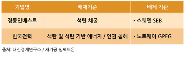 경동인베스트는 스웨덴 SEB로부터, 한국전력은 노르웨이 GPFG로부터 투자를 배제당한 것으로 알려졌다. SEB는 2008년부터 책임투자의 중요성을 강조하며 비즈니스의 지속가능성에 문제가 있는 기업을 투자 포트폴리오에서 제외하고 있다.