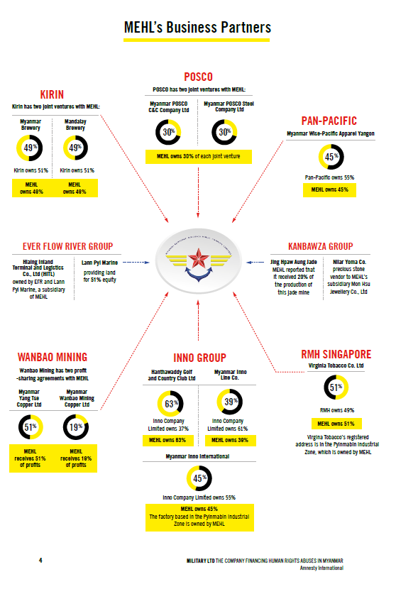 국제인권단체 앰네스티는 지난해 발간한 보고서에서 “미얀마 군부가 MEHL을 통해 막대한 수익을 벌어들이고 있다”며 MEHL과 공동으로 사업을 운영하는 글로벌 기업들을 비난했다. 일본 맥주업체 기린홀딩스와 함께 한국 기업으로는 포스코강판, 부동산 개발업체 이노그룹, 의류생산 수출업체 태평양물산 등이 꼽힌다. 미얀마포스코C&C는 이에 대해 “2017년 실적 배당 이후 MEHL에 배당금을 지급한 적이 없다”는 입장을 밝히고 있다.