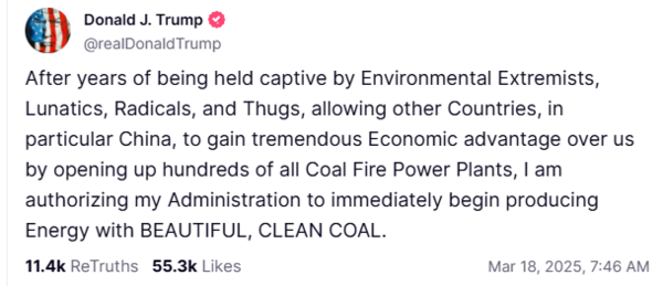지난 18일(현지 시각), 도널드 트럼프 미국 대통령은 소셜 미디어를 통해 중국과의 경쟁에서 우위를 점하기 위해 석탄 화력 발전 확대를 추진하겠다고 밝혔다. 트럼프 대통령은 "아름답고 깨끗한 석탄(Beautiful, Clean Coal)을 이용한 에너지 생산을 즉각적으로 승인하겠다"고 선언하며, 석탄 산업 재활성화를 약속했다.