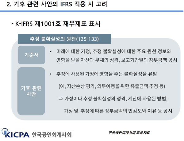 이러한 정성적 접근은 향후 재무 공시에서 한계에 직면할 수 있다. 국제회계기준(IFRS) 제1036호(자산손상), 제1037호(충당부채) 등 여러 회계 기준은 기후 리스크가 미래 현금흐름에 영향을 미칠 경우 이를 수치화해 반영하도록 요구하고 있기 때문이다.