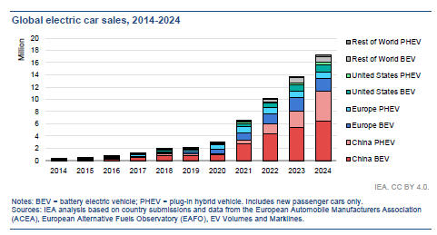 실제로 글로벌 전기차 연간 판매량은 2014년 약 30만 대에서 2024년 1800만 대 수준으로 10년 새 60배 가까이 급증했다. IEA는 이러한 성장 속도가 중국을 중심으로 한 배터리 전기차(BEV) 주도 구조에 기반하고 있으며, 2020년 이후 연간 4~5백만 대씩 늘어나는 추세가 이어지고 있다고 분석했다.