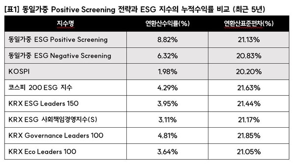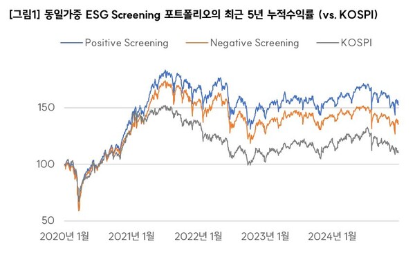 보고서는 동일가중 ESG Positive Screening 포트폴리오의 최근 5년 연환산수익률은 8.82% , 동일가중 ESG Negative Screening 포트폴리오의 경우 6.32%로 KOSPI의 1.98%를 크게 상회하는 성과를 보였다고 밝혔다. 이러한 초과 성과는 삼성전자, SK하이닉스 등을 비롯한 KOSPI의 시가총액 상위 종목의 변동이 동일가중 방식으로 인해 제한적으로 반영되었기 때문으로 분석된다.
