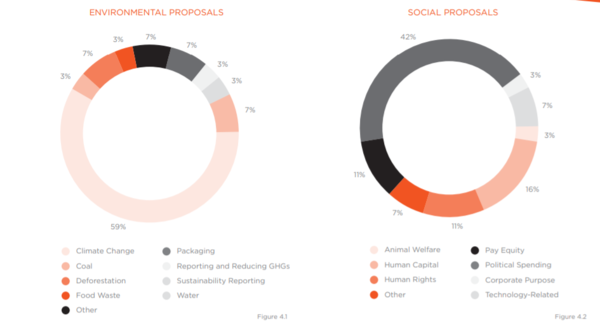 안건이 다양해졌을 뿐 아니라 주주제안에 대한 찬성률도 높다. 글로벌 의결권 자문업체 글래스루이스의 보고서에 따르면 미국 기업 주주제안에 대한 찬성률은 각각 31%, 28%로 각 기업의 정책을 바꾸는 결과로 이어지진 못했지만 주주제안에 대한 찬성 비율이 빠르게 높아지고 있었다.