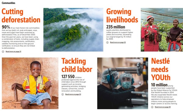 네슬레는 최근 발표한 지속가능보고서를 통해 유엔 지속가능발전목표(SDGs)와 관련해 설정한 36개의 공공 목표 중 28개를 달성했다고 강조했으며, 아직 달성하지 못한 목표에 대해서는 향후 실현 계획을 제시했다.