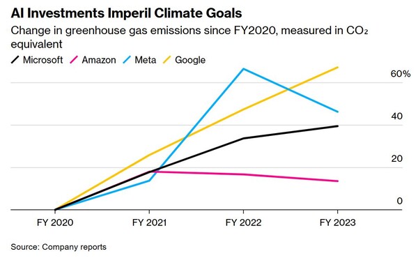 AI 수요 확대에 따라 데이터센터 인프라가 급격히 확대되면서, 미국 빅테크 기업들의 탄소배출량이 다시 증가세를 보였다.