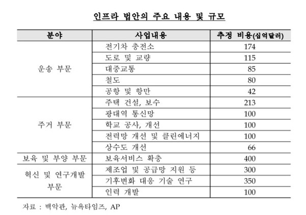특히 이번 인프라 법안에선 운송·전력·저탄소 경제 전환 부문에 많은 지출을 할당했다. 운송부문에선 1740억달러를 투자해 전기차 충전소를 만들고, 전력망 개선엔 1000억달러를 투자한다. 제조업 및 공급망 지원에 3000억달러를, 기후변화 대응 기술 연구에는 3500억달러를 할당했다.