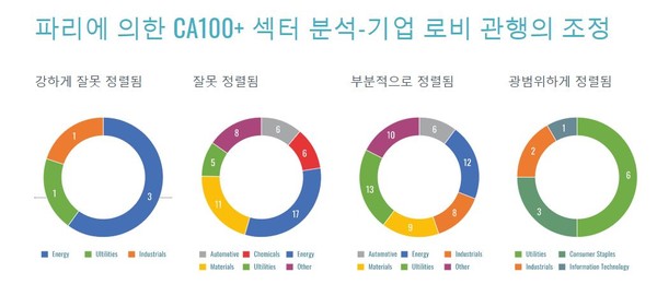 싱크탱크 인플루언스맵이 탄소 배출을 저감하려는 투자자 행동 이니셔티브인 기후행동 100+(CA100+)이 관리하는 전 세계 300개 기업과 150개 산업협회를 대상으로 로비 활동에 대해 조사한 결과, 91%의 기업이 파리협정에 맞지 않는 로비를 벌이는 산업 협회에 적을 두고 있거나 기후대응을 미루기 위해 로비를 벌인 것으로 확인됐다.