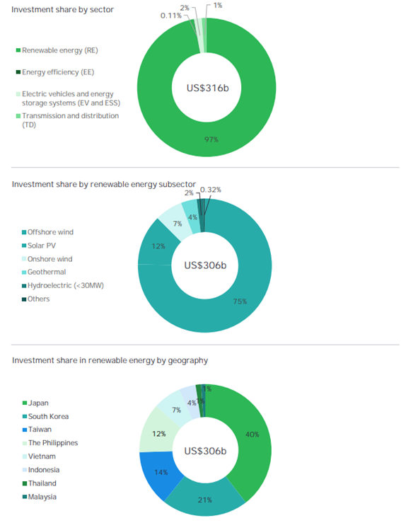 먼저 아시아 8개국의 에너지 분야에 대한 녹색 투자를 평가한 결과, 800개 이상의 프로젝트가 확인됐다. 이번 결과는 공공의 데이터를 기반으로 확인된 것이기에 민간으로 확대하면 더 많은 프로젝트가 있을 것으로 전망된다. 확인된 800개의 프로젝트의 총 투자액은 약 3160억달러(352조1000억원)였으며, 이중 약 3060억달러(341조원)가 재생에너지에 대한 투자로 나타났다.