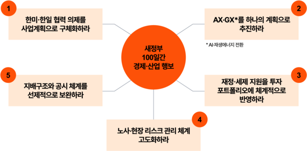 보고서에 따르면 새정부는 출범 100일 동안 저성장과 공급망 불안 등 복합 위기 속에서 경제 성장을 국가적 목표로 삼고, 산업별 전략을 구체화했다. 핵심 정책으로는 인공지능(AI)과 재생에너지 인프라 구축(AI·에너지 고속도로), 전략산업 혁신, 자본시장 및 기업 거버넌스 제도 개선 등이 제시됐으며 올해 하반기부터 본격적인 정책 실행이 예고됐다.