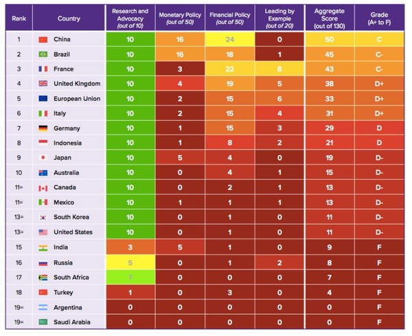 이번 평가지표로는 중앙은행이 녹색금융으로 전환하기 위해 필수적으로 진행해야 하는 정책 4가지가 사용됐다. ▲(녹색금융에 대한) 조사 및 지지(10점) ▲통화 정책(50점) ▲금융 정책(50점) ▲모범사례(20점)로 구성됐으며, 구간별 A+에서 F등급까지 나눴다. 비록 중국이 1위를 차지하긴 했지만 130점 만점에 50점으로 C등급을 기록, G20 국가들 중 선도적으로 녹색금융을 진행하고 있다고 평하긴 이르다.