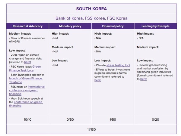 특히 국내에선 선진적으로 평가 받았던 정책들도 글로벌 수준에선 미미한 대응이라는 평가를 받았다. 예를 들어 금융위원회가 발족한 녹색금융 TF, 금융감독원의 기후 스트레스 테스트, 녹색 분류체계 등이다.