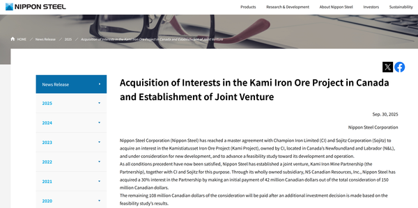 일본의 일본제철(Nippon Steel)이 캐나다 카미(Kami) 철광석 프로젝트의 지분 30%를 매입하고, 호주의 챔피언 아이언(Champion Iron, CIA) 및 일본 종합상사, 소지츠(Sojitz)와 함께 합작 회사를 설립한다고 30일(현지시각) 밝혔다.