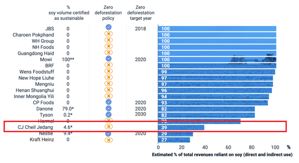 MSCI의 분석에 따르면 CJ셀렉타는 동종업계 최고 대두단백 생산 업체지만, 지속가능한 대두를 사용하는 비율은 4.6%에 그쳤다. 네슬레는 9.4%, 다논은 79%, 마린하베스트는 100%를 기록했다. 더불어 JBS, MOWI, CP Foods, 다논, 타이슨, 네슬레가 제로 삼림 벌채 정책을 펼치고 있는 반면, CJ셀렉타는 이와 관련된 정책을 표하지 않았다.