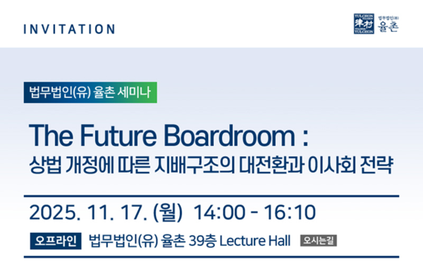법무법인(유) 율촌이 오는 11월 17일 ‘The Future Boardroom: 상법 개정에 따른 지배구조의 대전환과 이사회 전략’을 주제로 세미나를 연다. 행사는 오후 2시부터 4시 10분까지 서울 강남구 율촌빌딩 39층 렉처홀에서 열리며, 율촌 기업지배구조센터가 주관한다.